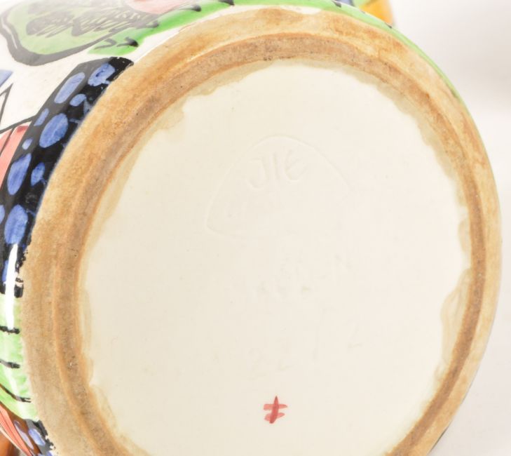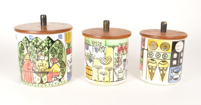 Anita Nylund - JIE Gantofta - Three 1960s Swedish ceramic storage jars all with teak lids. Comprised of a coffee, rice, and sugar jar. Each decorated in the colourful illustrative 'Go Gay' pattern. All with makers' marks to their underside. Largest jar measuring approx. 15cm x 12cm x 12cm.