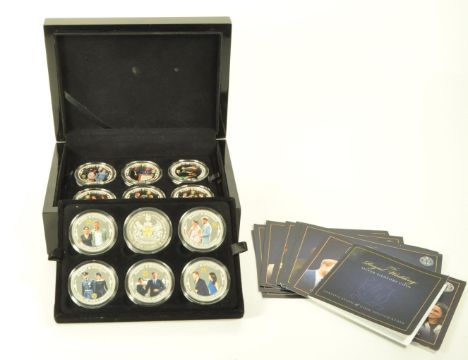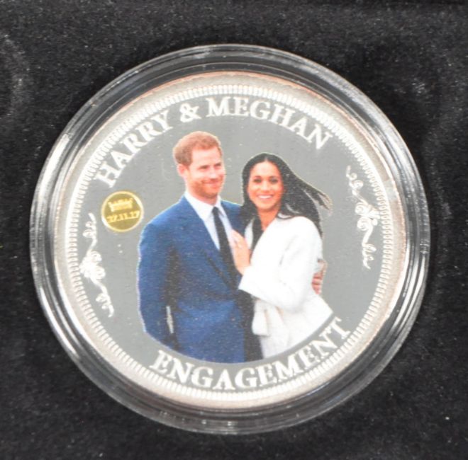 The Royal Wedding 2018, Prince Harry & Meghan Markle, Duchess of Sussex. A silver layered coin pack commemorating the wedding, 18 coins in total with certificates, including a silver piedfort coin 50g, other coins weigh 28.28 each.