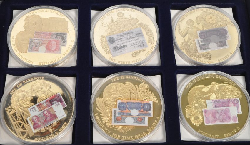 Windsor Mint, England - British Banknote commemorative strike proof coins. Twelve in total, featuring the fifty pound, the one pound banknote, 10 shilling banknote, the £1000 banknote etc. With certificate.