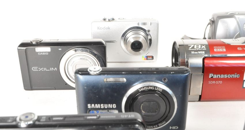 A collection of 20th century digital cameras to include Pentax Optio, Lumix DMC-FX12, SamsungST45, Exilm Casio, Kodak EasyShare, Samsung ST72, Kodak Easyshare 7.1, Hitachi HDC-57IES, LUmix DMC-ZX1, Panasonic SDR-S70, Lumix DMC-TZ11, Hitachi HDC-99IE,