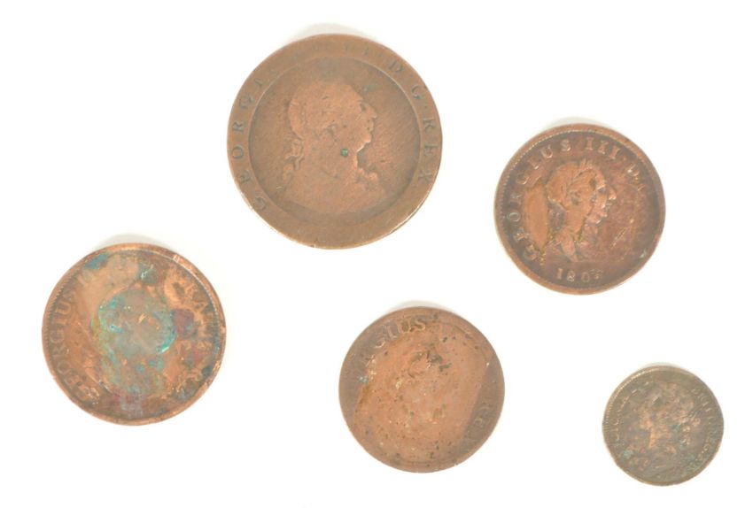 Collection of Georgian late 18th / 19th century copper coins. Comprised of a 1799 George III half 1/2 penny, an 1893 Victoria farthing, an 1806 George III half 1/2 penny, a 1797 George III one penny Cartwheel and an 1805 George III Irish half 1/2 penny. Largest measuring approx. 34mm in diameter.