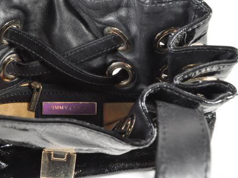 Jimmy Choo - Vintage designer black leather hand bag / two strap shoulder bag. The black leather with flap top and signature lock closure, dual handles, gold tone hardware and belt detailing. Measuring approx. 33cm x 25cm.