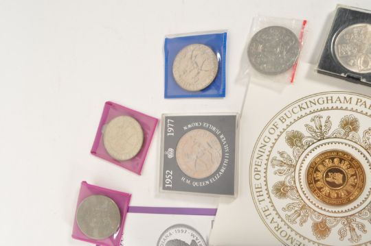 A collection of 20th century British commemorative crown and five shillings coins. The collection featuring examples such as 1965 Churchill, 1981 Royal Wedding, and 1977 Silver Jubilee amongst others. To include twenty one examples in total. Alongside two 1998 The Opening of Buckingham Palace medals, and a 1997 Liberia The People's Princess Princess Diana Silver Proof 20 Dollars.