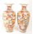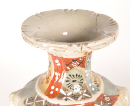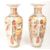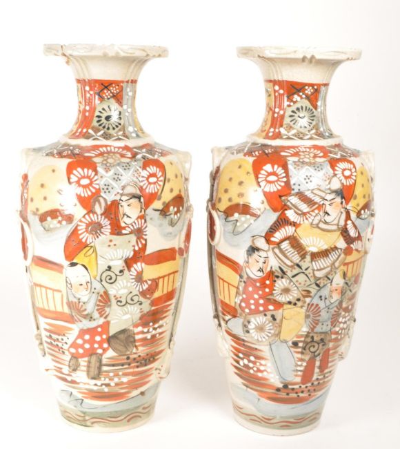 Two Japanese Meiji period Satsuma pottery vases. Featuring traditional figures in a red, blue and yellow colourway with white enamel floral detailing to the main body. Red makers marks to the underside of each vase. Each measuring approx. 31cm x 14cm. Sold AF.