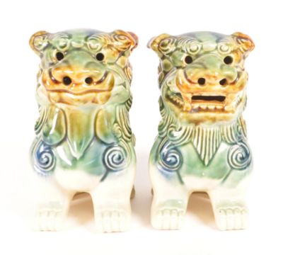 Two mid 20th century circa 1940s Chinese temple forest foo dogs. Ceramic construction in green / yellow colourway in a seated position. 14cm height approx.