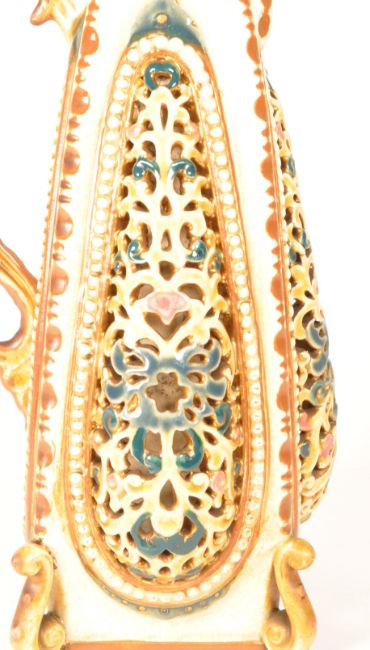 Zsolnay - An early 20th century Hungarian ceramic jug ewer. Having a mythical dragon figure as handle, finial topped lid, on pierced and bowed panelled body with scrolled mounts. 1854 on base with further numbers 36 & 80. 29cm height approx.