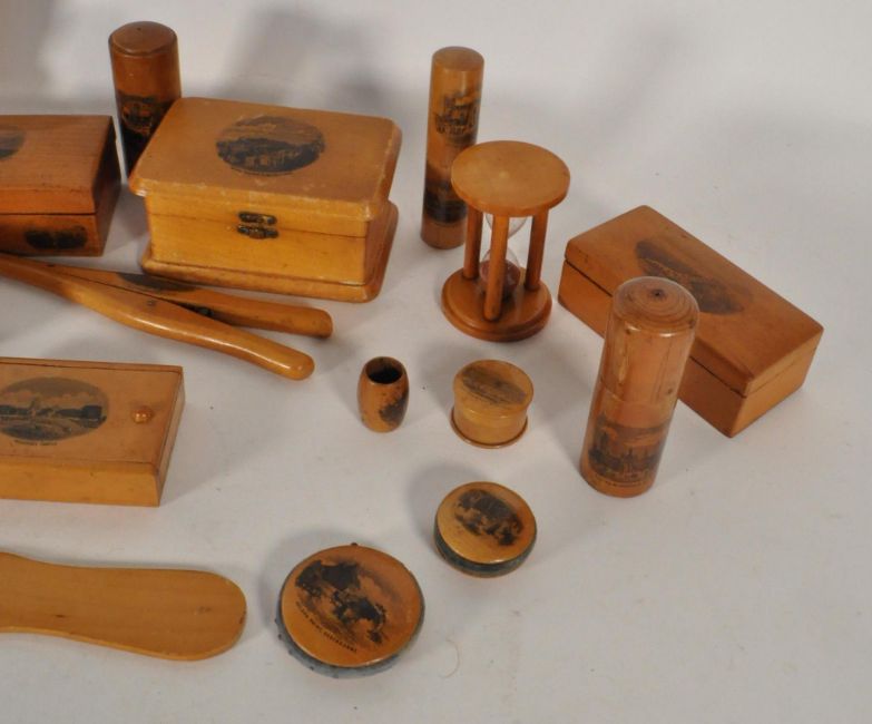 Collection of 19th century South East / Sussex related Mauchlin ware. Examples include lidded boxes, clips, pin cushions / holders, hourglass, egg containers, perpetual calendar, and more. Featuring locations such as Eastbourne, London, Worthing, Newhaven, and Littlehampton.