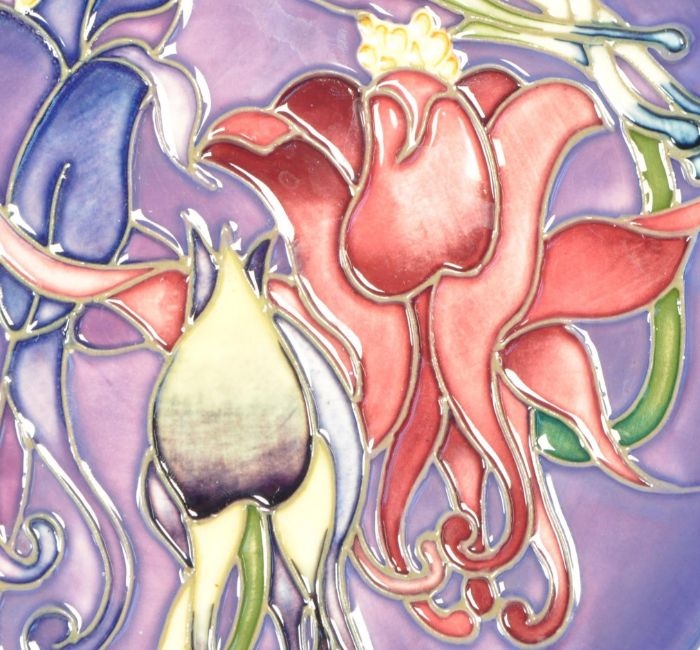 Moorcroft - 1999 Trial pottery plate. Decorated with a floral design in a purple, pink and green colourway on a purple ground. Stickered to the reverse 'Trial/Dated piece released exclusively for the Moorcroft Collectors Club open weekend'. Makers mark and date to the underside. Measuring approx. 15.5cm x 1.5cm.