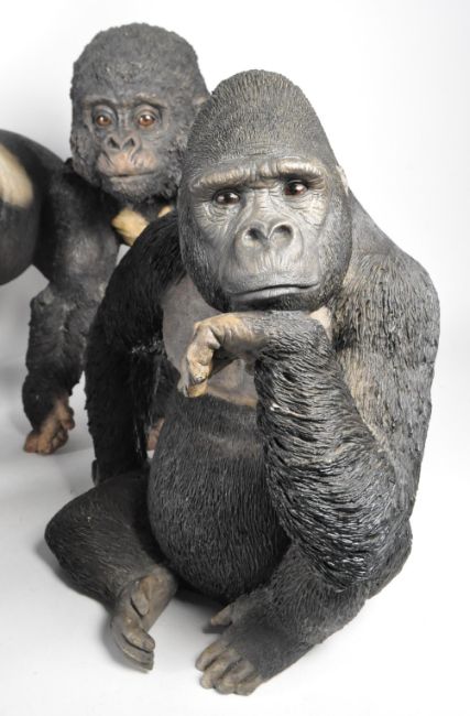 A collection of x5 resin Gorilla figures / statues in seating and standing poses. Makers marks for Leonardo Collection, Artform UK and Country Artists. Largest measures approx 42cm.