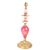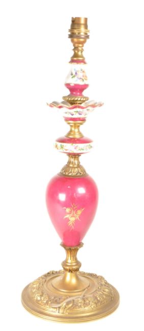 French early 20th century brass and porcelain table lamp base. Features porcelain body segments with hand painted floral decoration and a circular brass base with moulded flowers. Light fixture atop. Measuring approx. 44cm tall.