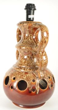 Fosters of Newlyn - Mid century pottery lamp base featuring a brown glaze with twin handles and pierced design to the globular body. Twin bulb light fixture. Measuring approx. 46.5cm x 25cm.