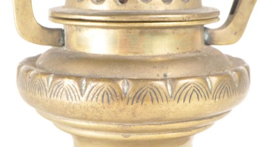 1920s / 30s vintage Chinese brass lidded censor incense burner. Featuring a Foo Dog / Temple Lion on the lid atop with engraved border around the body and a handle either side all raised on a circular base. Measuring approx. 13cm x 14cm x 9cm.