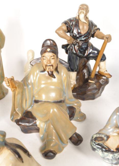 A collection of x13 Oriental Chinese glazed ceramic Mud Men figurines wearing traditional clothing and varying poses to incude; pottery man, seated board game players, banjo musician and others. Largest measures approx 23cm.