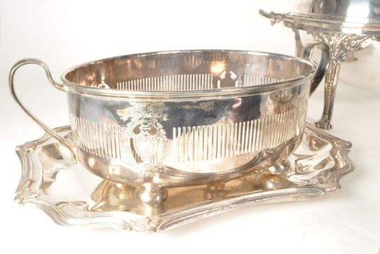 Collection of late 19th / early 20th century silver plated and white metal dinner wares. Comprised of a Beresford Plate EPNS no. L 6000 shell dish, a William R. Shirtcliffe (W.S & S) EPNS A1 no. 3844 breakthrough shell basket, a Marples & Co (M&Co) EPNS A1 hard soldered 1152 revolving dome top server, an unmarked engraved handled sweet dish, an unmarked serving tray, and an unmarked flower vase. Largest piece measuring approx. 14cm x 38cm x 26.5cm.