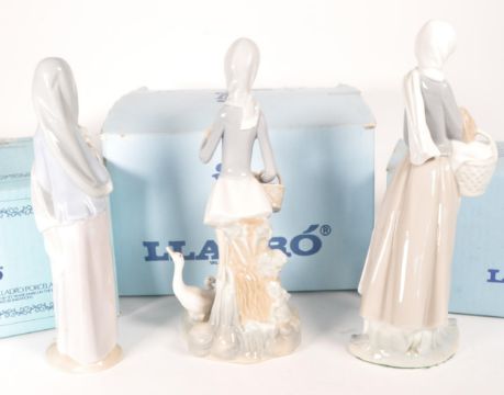 Lladro - Three late 20th century porcelain lady figures. Comprised of no. 4650 girl holding lilies, no. 4592 girl holding a chicken / hen, and no. 4510 girl with ducks and an umbrella. All housed within associated boxes. Largest measuring approx. 15cm x 25cm x 22.5cm, including the box.