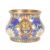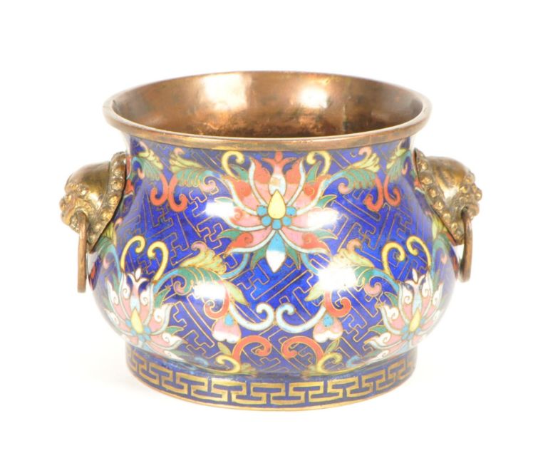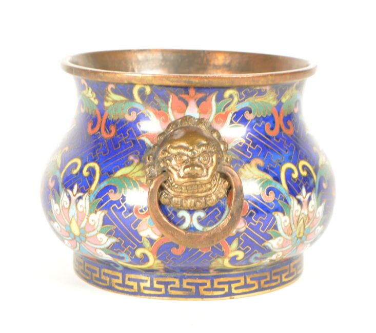 Early 20th century Chinese cloisonné brass pot. Bulbous body with twin brass fu dog heads with rings. Blue ground with floral enameled decoration and Greek key style border.