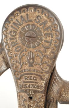 Early 20th century original safety cast iron corkscrew workbench clamp. Features Original Safety and registration mark no. 543083. Turned spherical wooden handle to end. Measuring approx. 25cm x 19cm x 15cm.