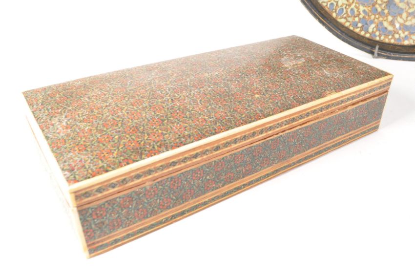 Two 20th century Persian Khatam inlaid lidded boxes with 19th century Kashmir papier mache circular tray. Tray decorated with floral / foliate motifs and gilt detailing. The two lacquered wooden boxes with intricate inlay, including one example decorated with enamel folk art. Largest piece measuring approx. 30cm x 30cm x 1.5cm.