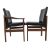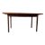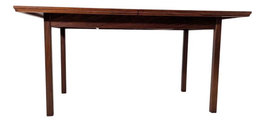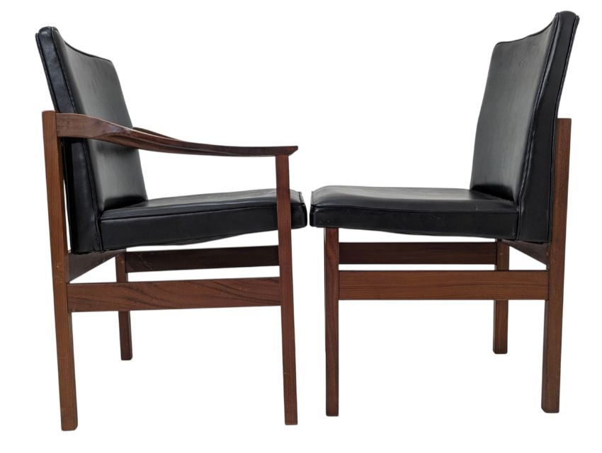 A retro mid-20th-century Danish teak dining table and matching six chairs. The extending table having a stright rectangular top with grooved edges raised on stright leg supports. Hidden leaf stored within. The matching set of six chairs having teak frames with black leather seat and backrests. Each raised on stright leg supports.