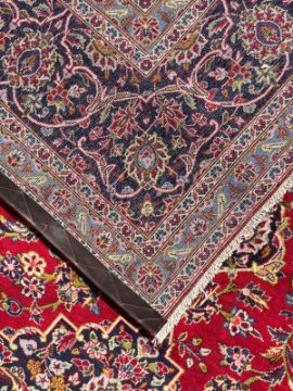 An early 20th century signed Central Persian Islamic Kashan hand woven wool floor carpet rug. The carpet having a central medallion intricately decorated with floral motifs. Central red ground panel with matching decorations. Intricate outer panels with short tassels to ends.