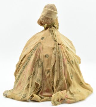 A late 19th century French boudoir porcelain pin doll. The doll with porcelain head & upper body, modelled with coiffured hair. Wearing a tissue fabric dress & hand woven lace bonnet, wearing wire hooped skirt.