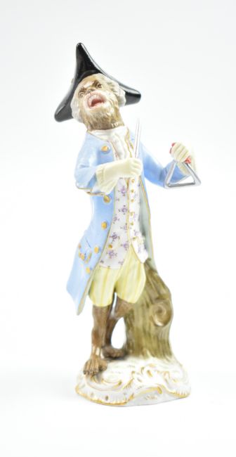 Meissen porcelain - a 19th & 20th century composite porcelain anthropomorphic monkey band suite of twenty figurines / players. After the original models by J. J. Kaendler and P. Reinicke. Marks for Meissen dated between 1815 and 1945. Comprising: conductor, bagpipe player, cellist, drum & pipe player, a monkey with drums on his back, a monkey with drumsticks, a flautist, a French Horn player, a guitarist, a harpist, a hurdy-gurdy player, three singers, an oboeist, a pianist, a pipe player, a triangle player, a trumpet player & a violinist. Each mounted on gilt scrolled base. Various marks to underside incl. underglaze blue crossed swords, some painted marks, some impressed marks.