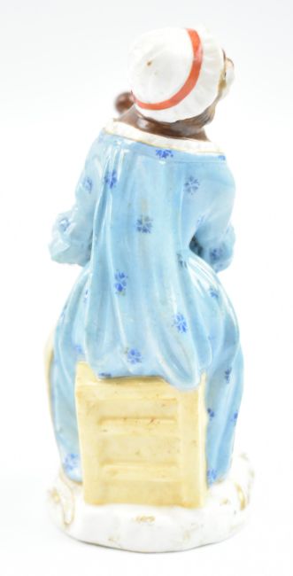 Hurdy gurdy player: slight patch of unglazed ceramic to underside of skirt; evidence of having been repainted in places.