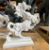 A pair of contemporary 21st-century carved solid white marble sculptures of rearing horses. Each depicted in a Chinese manner with a slender body, flowing mane and tail with clouds surround. All raised on stepped plinth bases.