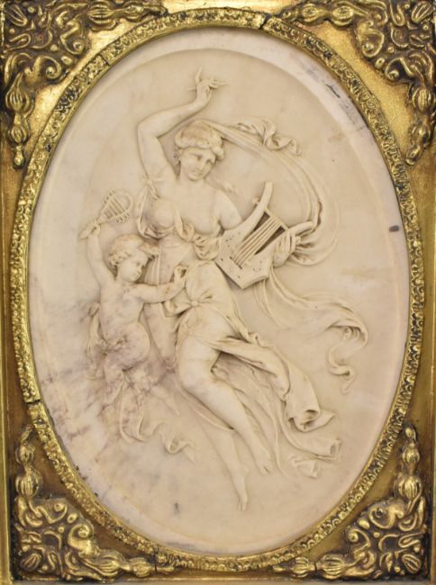 A pair of 19th century French Grand Tour style gilt framed alabaster relief roundels. Each roundel of oval form, featuring central scene of nude maiden & cherub with tambourine. Inset Exposition Nouvelle 1889 medal to verso. Presented in period decorative gilt frames.