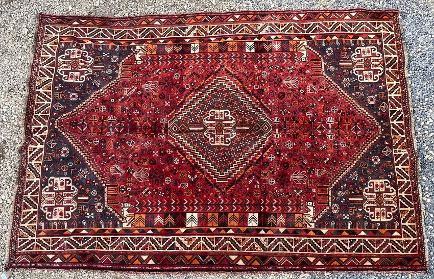 An early 20th century South West Persian Islamic Qashgai floor carpet rug. The carpet having a central geometric shaped red ground panel with intricately woven medallion. All decorated with stylised floral motifs. Series of outer borders. Short tassels to ends.