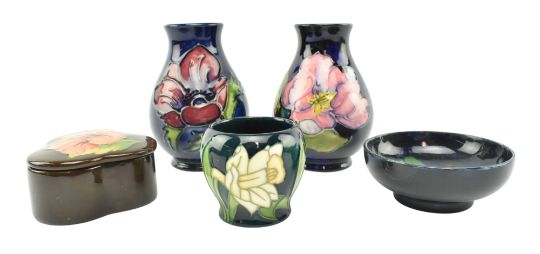 A collection of five miniature Moorcroft tubelined hand-painted pottery vases. The lot to include two bulbous vases on cobalt blue ground, one with anemone pattern, one with Clematis pattern. An Orchid pattern miniature footed bowl. A Daffodil pattern baluster miniature vase. Together with a trifoil lidded trinket box in the Anemone pattern.
