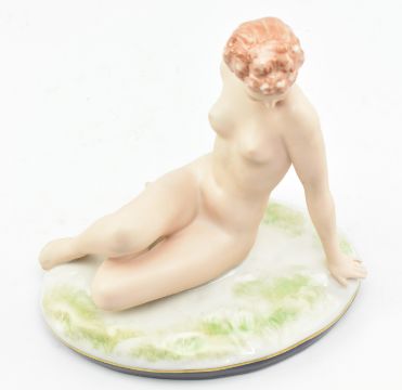 Royal Dux Bohemia - a hand painted bisque ceramic figure of reclining nude lady. The figure with short hair and leaning on arm. Raised on an oval naturalistic base. Stamped to base & with pink triangular mark.