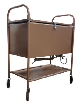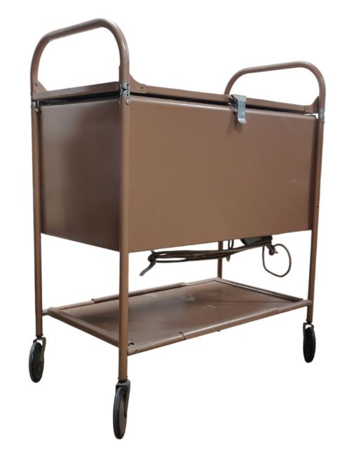 An original vintage 1960s Hawkins made Trolley Hostess food warming trolley. Featuring four pyrex compartments to the interior for keeping food warm, with a shelf underneath. On wheels. Measures 85cm tall. 2013.331