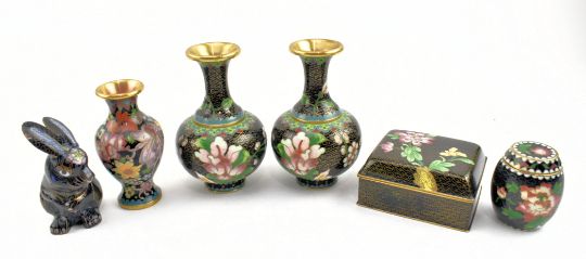 A collection of six 20th century Chinese cloisonne enamelled vases & trinket boxes. The lot to include a pair of small flared mouth bottle vases. Each vase decorated with rui motifs and flowers. Together with a smaller cloisonne vase decorated with assorted floral designs. Further two trinket boxes. A rectangular cloisonne box decorated with sprig of flower and the other is a in a form of drum stool, decorated with flowers. Further together with a cloisonne rabbit.