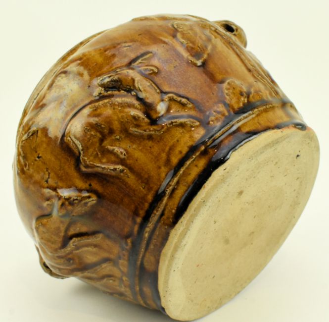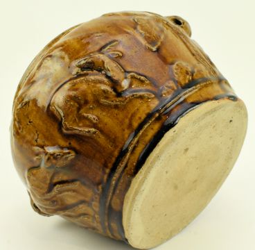 Two Qing dynasty earthenware pottery jars / vases. The lot to include a yellow glazed jar. The jar decorated with two lion head handles, ruyi motif to the shoulder, relief figure of dragon, deer and chicken on the body. Unglazed to the base. Together with a green glazed vase. The vase has an everted mouth rim, six lugs on the shoulder. A moulded dragon with carved scales on the body. Unglazed to the base.