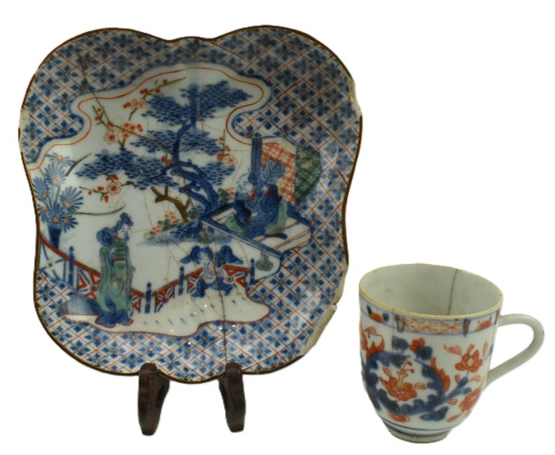 Two 18th/19th century Chinese & Japanese porcelain pieces. The lot to include a 18th century Kangxi period Imari coffee cup. The cup is decorated with blue, red and gilt floral design. Together with a 18th century Japanese Arita porcelain lobe shaped shallow dish, decorate with figurines and landscape. Foliate and flame motifs to exterior. Six-character 'Da Ming Jiajing Nian Zhao' marked to the base.