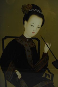 A Qing dynasty reverse painting on glass. The painting depicts a lady wearing a Manchu dress sitting on a chair, holding a water pipe in her hand, by the table where has a bowl of fruits, with original lacquered wooden frame.