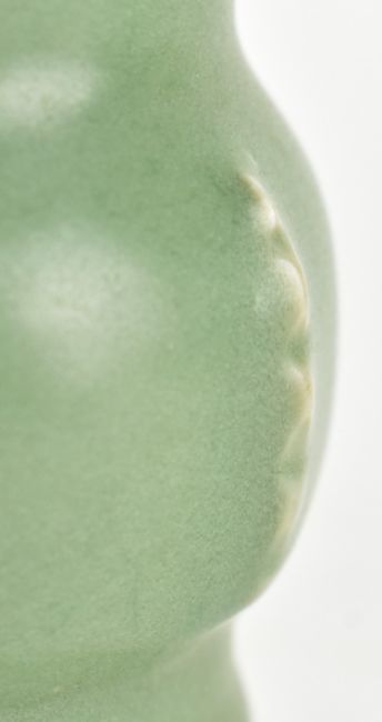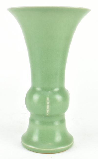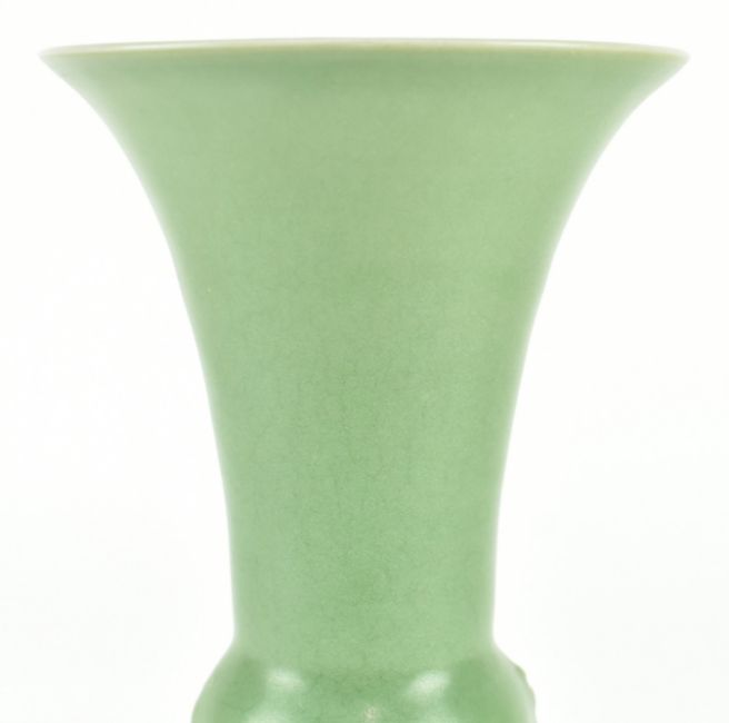 A Longquan celadon Gu-shaped ceramic vase. The vase having an archaic bronze shape with four flanges moulded in relief.