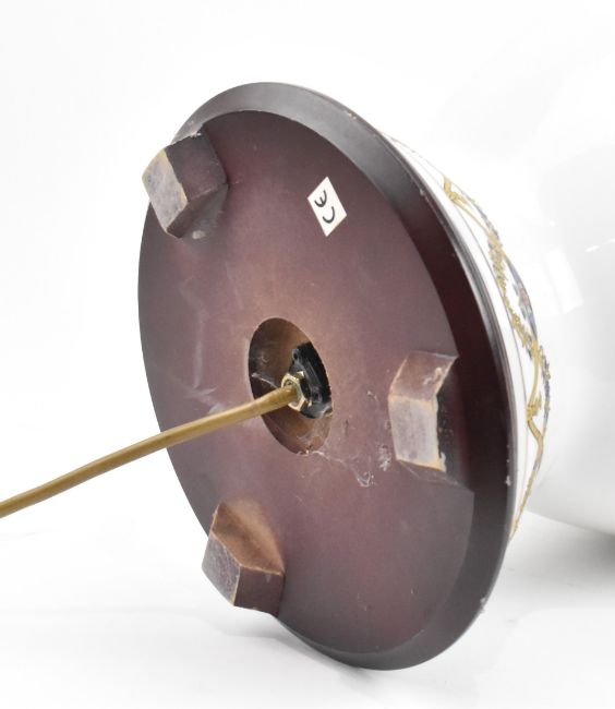 A Chinese export armorial porcelain table lamp case. The bluster-shaped lidded vase decorated with an Armorial pattern table lamp base, possibly Portuguese. Blue and gilt ribbon and vignette scrolling to the border of the cover, theshoulder and the bottom of the vase. Raised on a circular hardwood stand. Sold as untested.