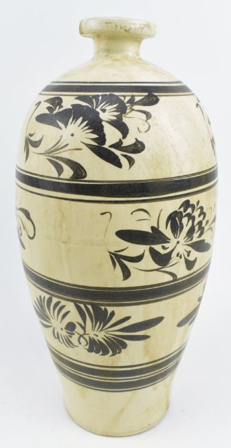A Chinese Song or later Cizhou meiping vase. The meiping vase modelled a short neck with everted rim, the body covered in cream glaze and dark brown paint with overlapping floral motifs.