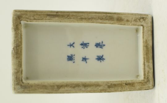 A 20th century blue and white polychrome enamelled pillow. The pillow decorated with open panels depicting figurines surrounded by foliage motifs. Six-character Kangxi marked to the base.