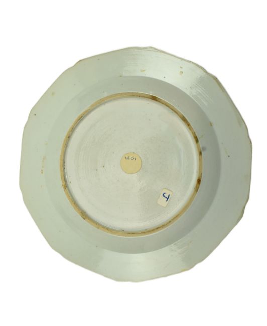 Collection of eight Qing dynasty 18th century porcelain pieces. The lot to include two famille rose porcelain charger plates, a famille rose teapot with metal handle, a famille rose creamer jug, three blue and white coffee cups / teacups and a blue and white delft charger.