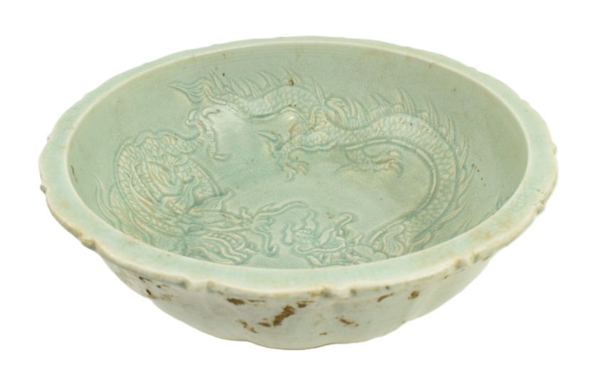A large Chinese celadon ceramic bowl. The circular barded rim bowl decorated with pale green glaze with two dragons to interior. Ribbed stripes to the exterior.