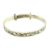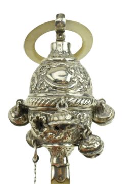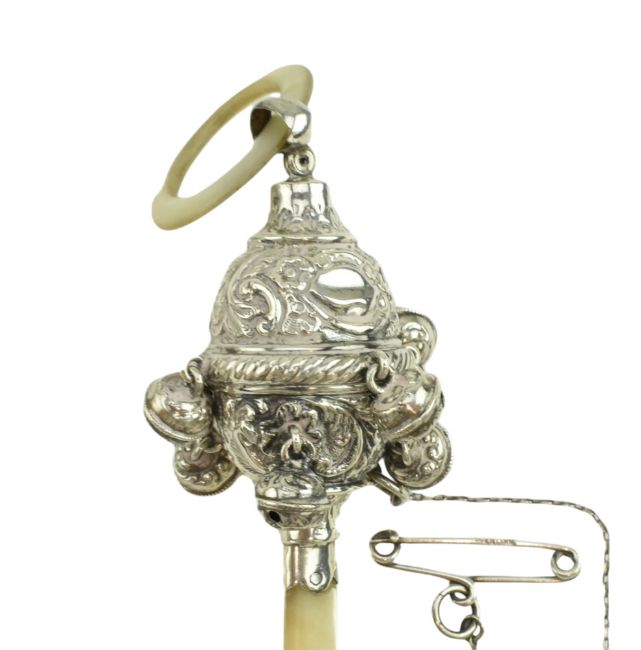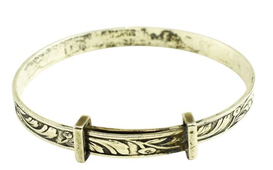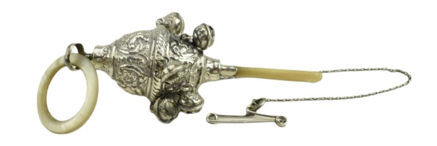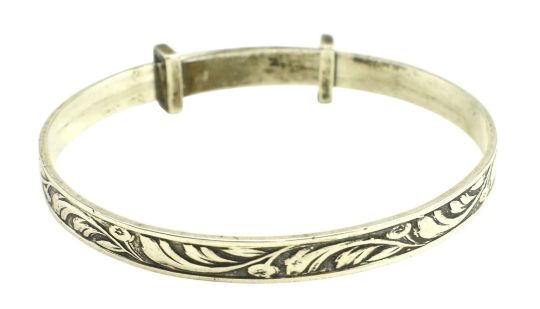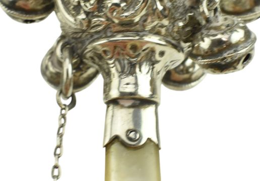 An Edward VII hallmarked silver & mother of pearl baby rattle / Christening set. The rattle being decorated with embossed floral and vignette designs. Mother of pearl hoop and handle. Birmingham Assay. The year and sponsor marks are rubbed. Together with a hallmarked silver baby bangle. Stamped silver. Total gross weight approx. 34.4g.