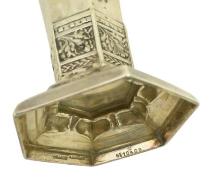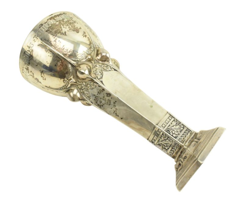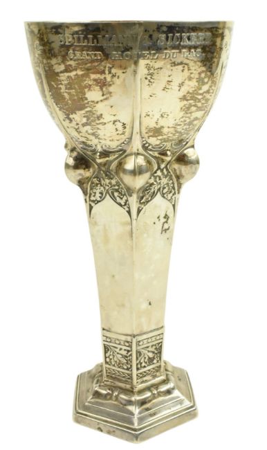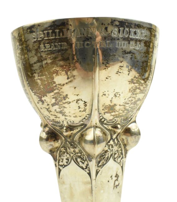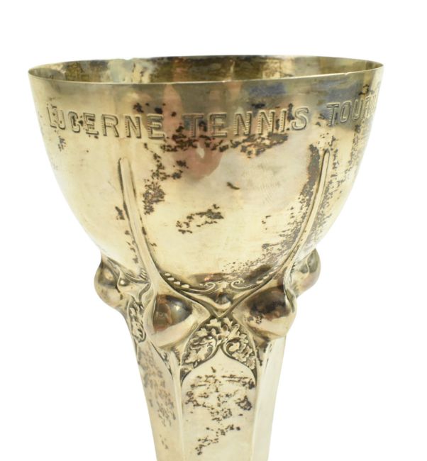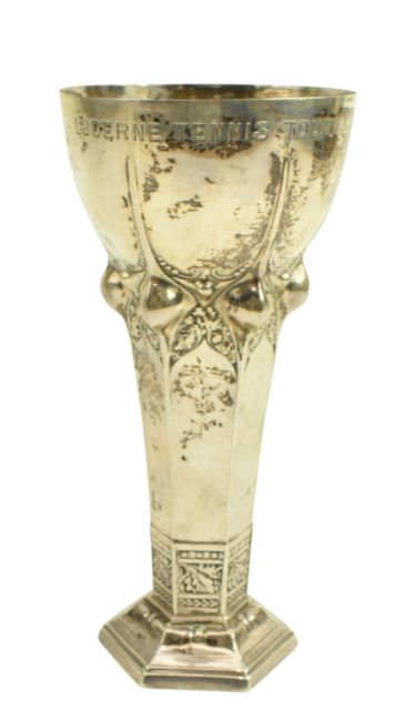 An early 20th century Art Nouveau German Sessionist trophy vase. Presentation inscription 'Lucerne Tennis Tournament 1911' & 'Spillmann & Sickert Grand Hotel Du Lac'. Stamped 800 By Bruckmann & Sohne, Artist A. Burger (?). Weight approx. 132.9g.