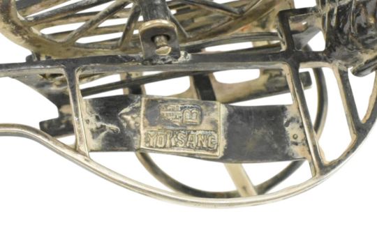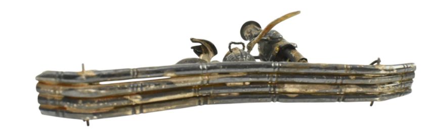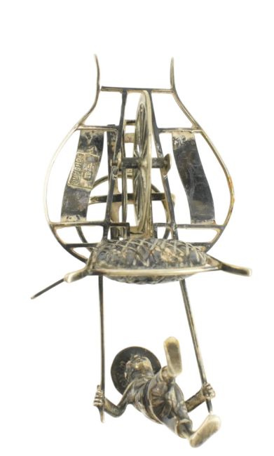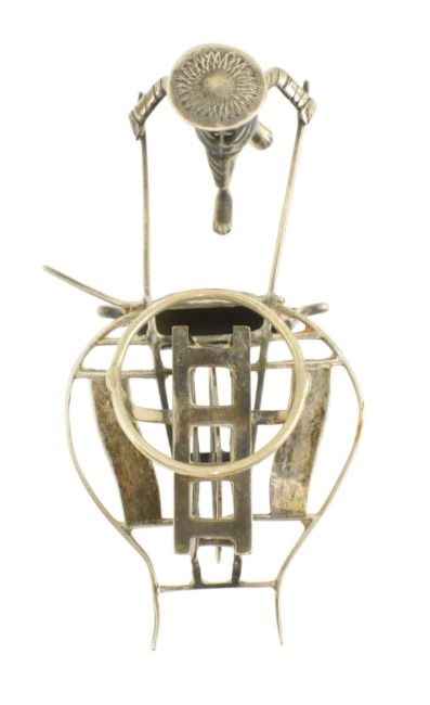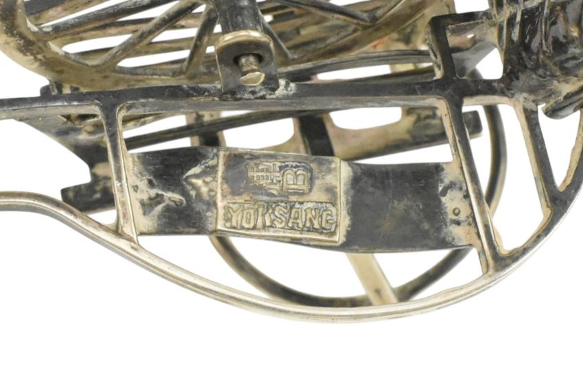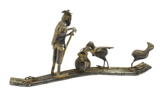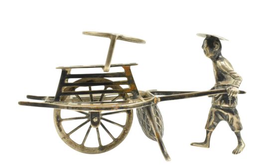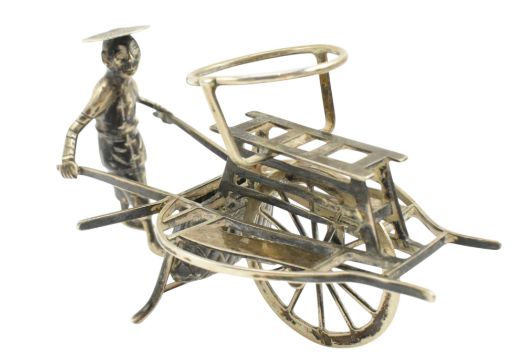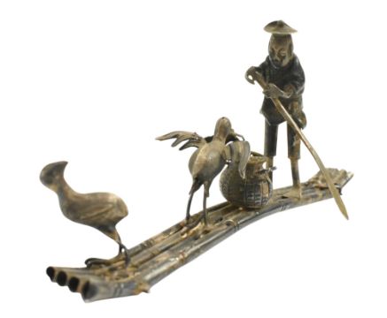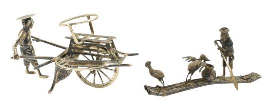 A 19th century Chinese export silver cruet / condiment stand. The figure being modelled of a merchant seller holding the handles of the pushcart. Stamped 'Yok Sang' and artisan's same. Together with a silver miniature figure of a fisherman on a bamboo raft. Unmarked. Test as silver. Total weight 43.8g.