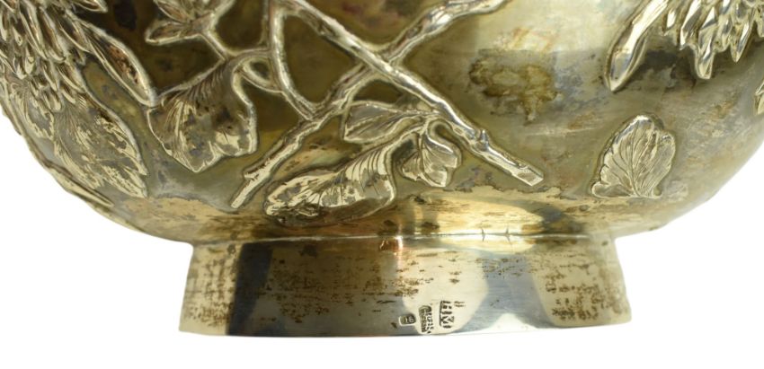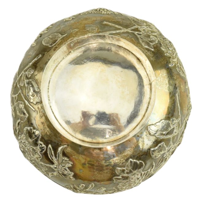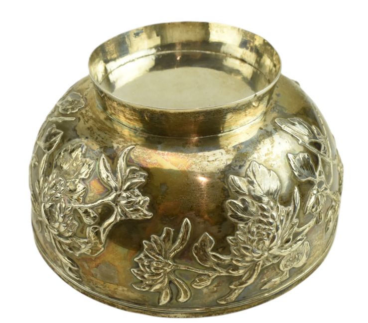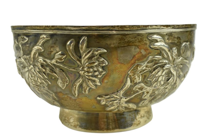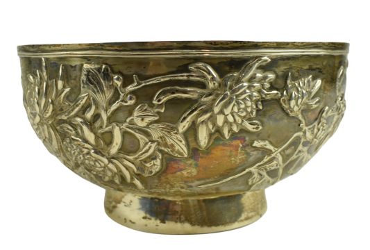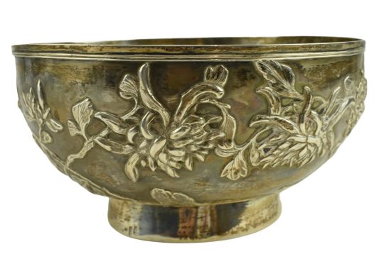 An early 20th century Chinese hallmarked silver bowl with relief chrysanthemum motifs throughout. Marked "泰安, HM, 90" to foot. Weight approx. 399.6g.