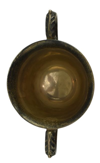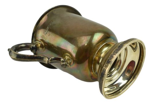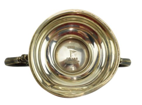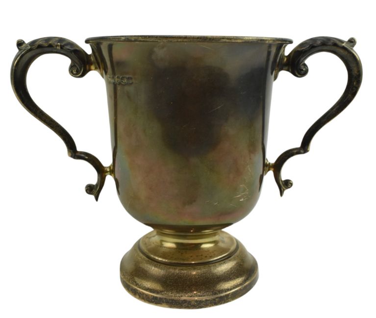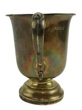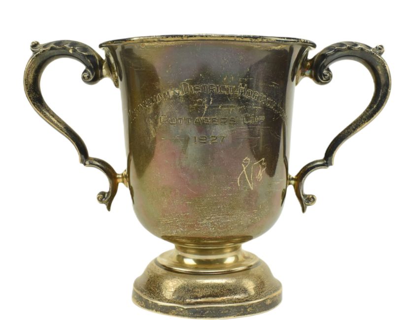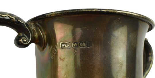 A George V hallmarked silver twin handled 1 pint trophy mug. Engraved 'Keynsham & District Horticultural Cottagers Cup 1927'. Hallmarked year 1926, Sheffield. Sponsors mark for Walker and Hall. Weight approx. 318.6g.