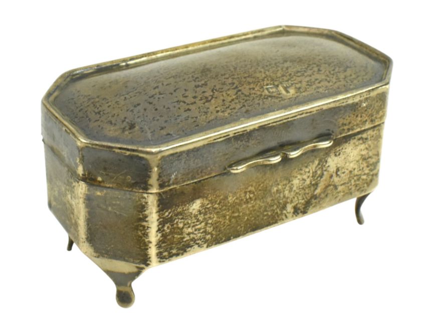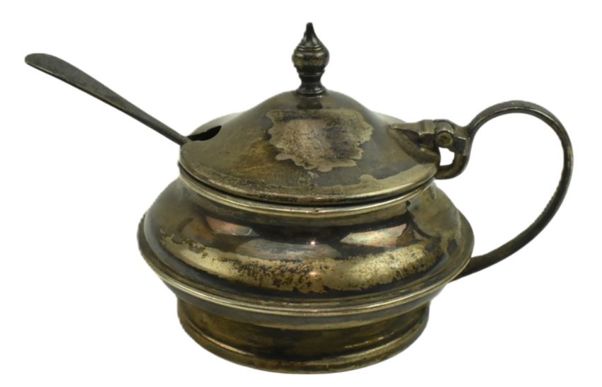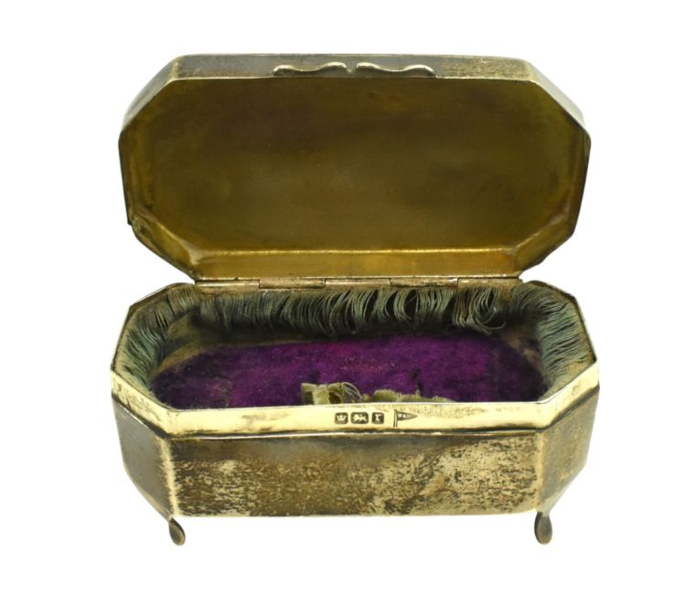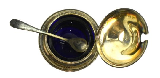 A William IV hallmarked silver knife. Hallmarked year 1836, Birmingham. Sponsors mark for George Unite. Together with an Edward VII hallmarked silver jewelry box. Hallmarked year 1909, Sheffield. Sponsors mark for Walker & Hall. Further together with a George V hallmarked silver & blue glass lined lidded condiment pot with a spoon. Hallmarked year 1923, Birmingham. Sponsors mark for Henry Moreton. Total gross weight approx. 186g.