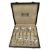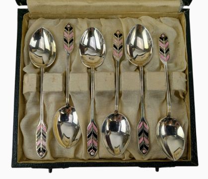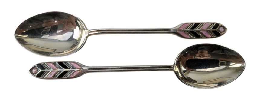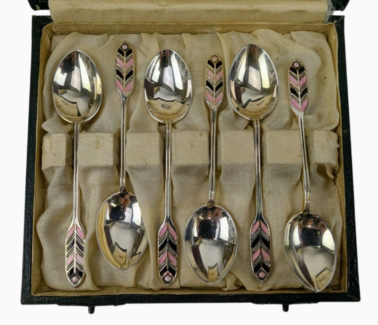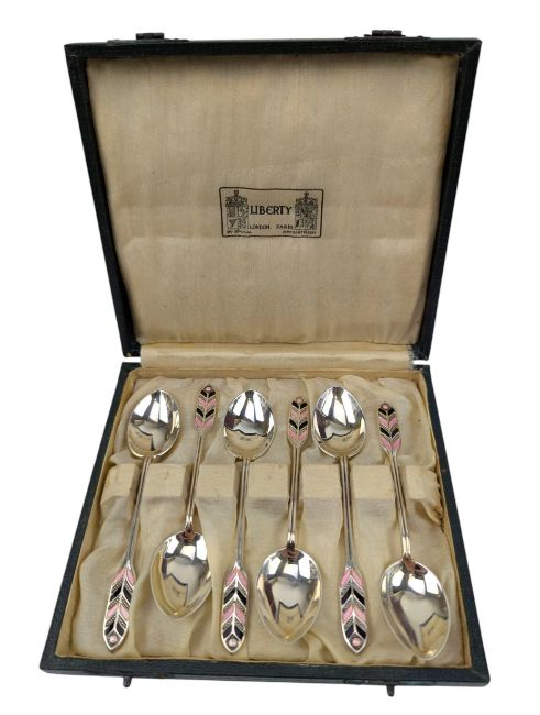 A set of 1930s Art Deco Liberty & Co silver hallmarked and enamelled coffee / tea spoons. The spoons having terminals with pink and black feathered enamel. Hallmarked year 1931. Sponsors mark for Mappin & Webb Ltd. In original Liberty & Co shagreen presentation box. Total weight approx. 53g.